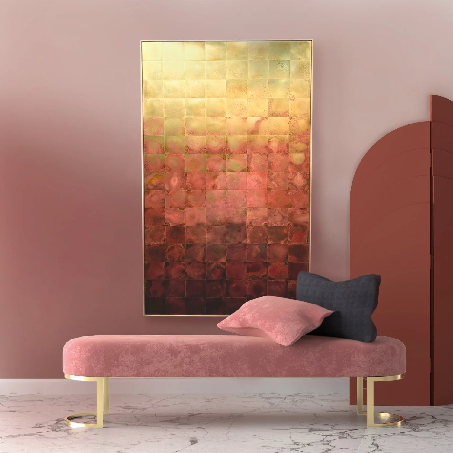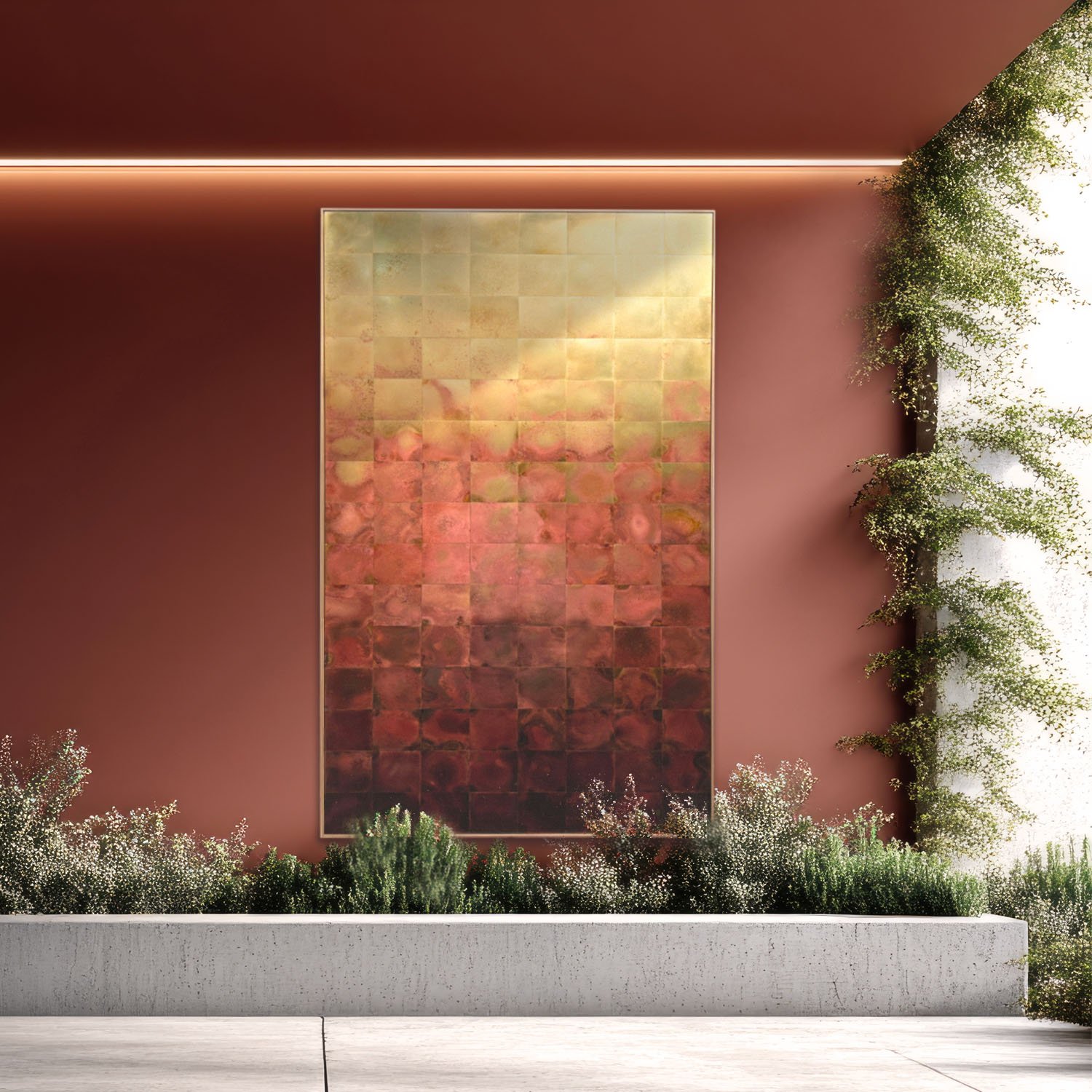 Materials: Solid brass sheet tiles, individually patinated and backed to a timber base, set within a beautiful brass frame (6mm W x 25mm D)