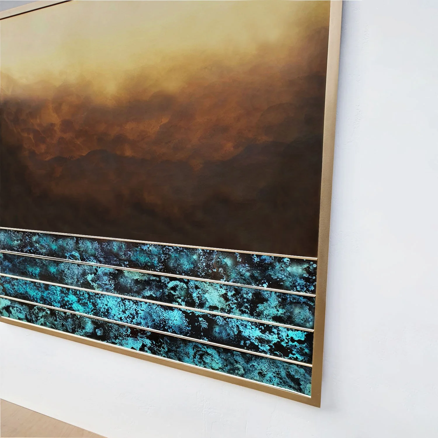 Strata of vivid verdigris unfold beneath an expanse of deep, clouded brass rising into warm gold, held apart by a single horizon line. Electric blues and greens contrast with warm, clouded gold, evoking sea and sky while remaining abstract. The Piece carries a quiet, meditative presence-expansive yet composed.