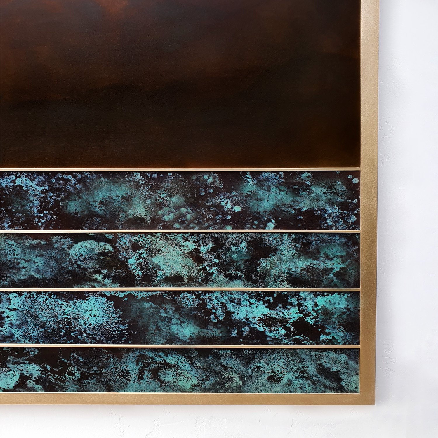 Materials: Solid brass artwork comprising individually patinated verdigris strips beneath a hand-finished brass panel with a natural tonal gradient. Divided and framed using precision solid brass sections throughout. Sealed with a high polish lacquer finish and waxed frame.
